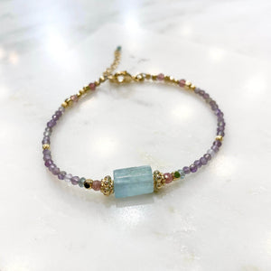 Ce joli bracelet orné d'une jolie aigue marine bleue, de pierres naturelles (aigue marine, grenat et améthyste) et de joli apprêt en plaque or offre un subtil mélange teintée de finesse et d’élégance.